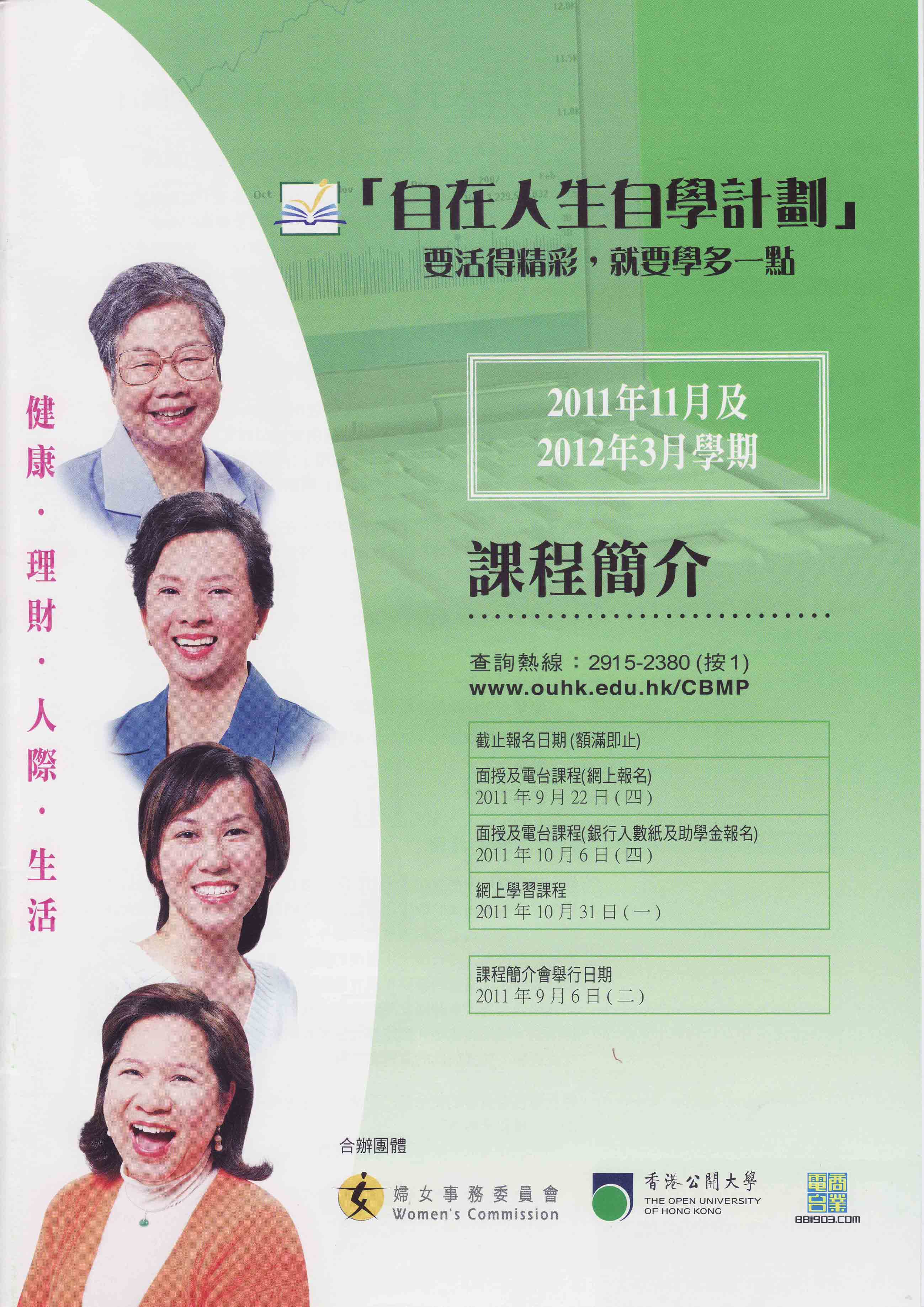 「自在人生自學計劃」是由婦女事務委員會倡議發起、香港公開大學李嘉誠專業進修學院及新城電台合辦,為針對婦女需要而設的創新學習計劃,旨在提高參加者的學習能力,幫助他們培養求知慾、發揮個人潛能、肯定自我,以正面態度面對不同挑戰,從而開創更精彩的人生。本計劃提供有數十個特別編撰、涉及不同範疇的電台廣播、面授和網上課程,由各區非政府機構參與協辦安排,讓全港婦女及有興趣人士自由選讀。